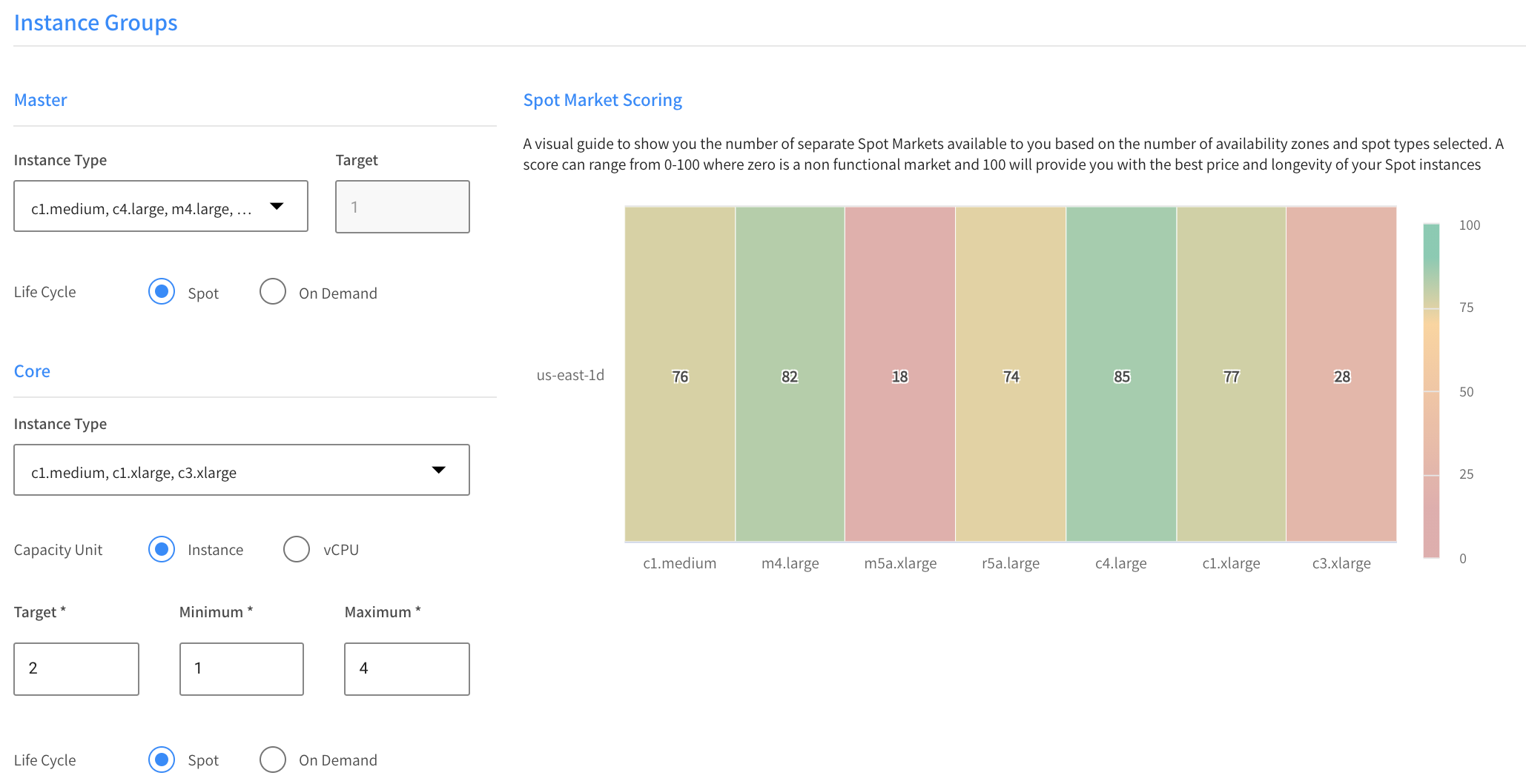 Amazon EMR provides a managed big data framework that enables you to easily add and remove cluster capacity to meet your analysis requirements. EMR supports Hadoop, Apache Spark and other popular distributed frameworks. Running your EMR clusters on Elastigroup provides you with significant discounts due to the fact that Elastigroup leverages spot instances while maintaining 100% availability. Elastigroup also enables you to create your EMR cluster with Elastigroup, significantly increasing your potential savings.